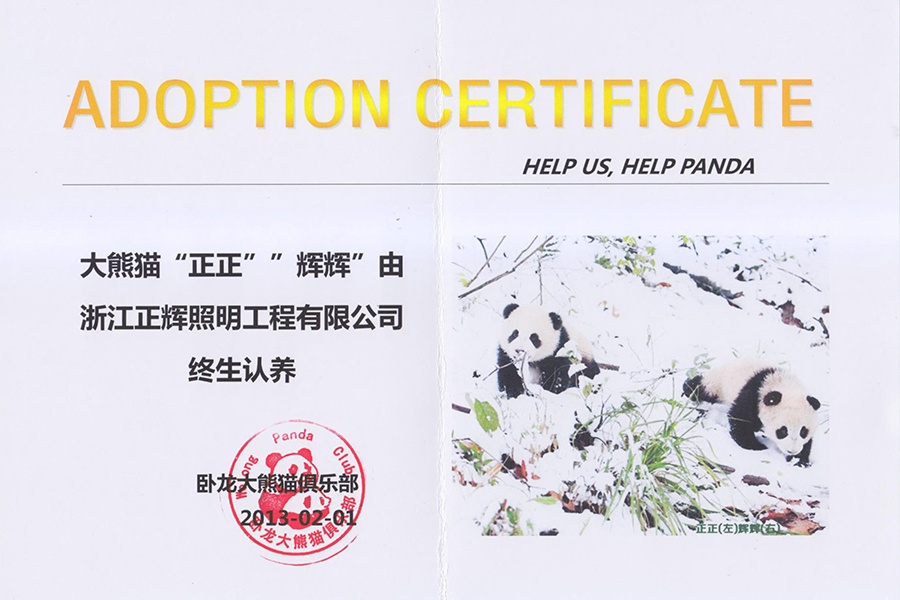 正輝公司終生認養兩只大熊貓 取名:正正、輝輝,正輝公司致力于綠色照明, 倡導節能環保對環境的關愛。 2013年,正輝公司與中國保護大熊貓 研究中心臥龍大熊貓俱樂部達成協議, 正輝公司終生認養兩只大熊貓, 它們分別命名為正正、輝輝, 展現了我們企業的社會責任和 在環境保護方面所做的努力。